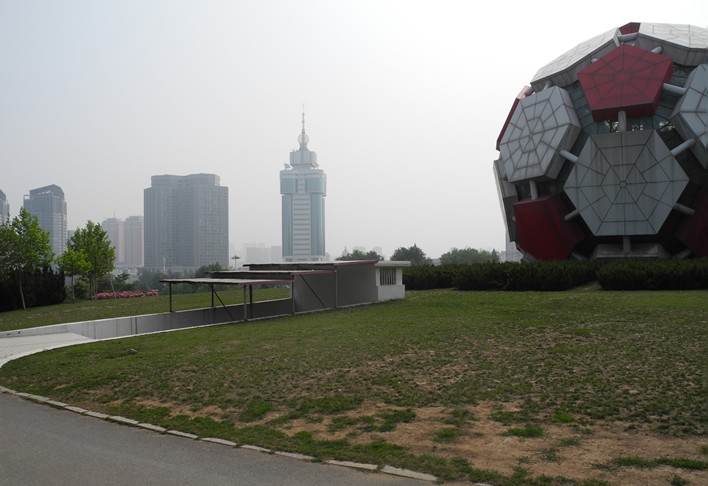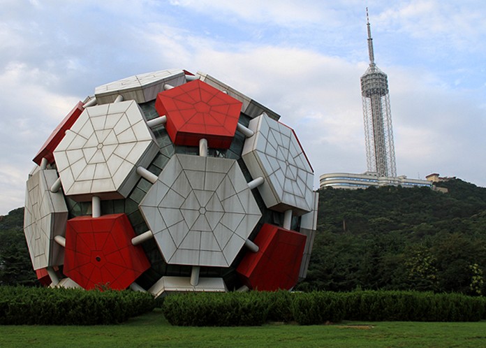 球形建筑藝術館里面陳列著大連各種建筑圖形,因為大連是足球城,所以它的外形便造成了紅白相間的球體。球體直徑19.6米,高21米。