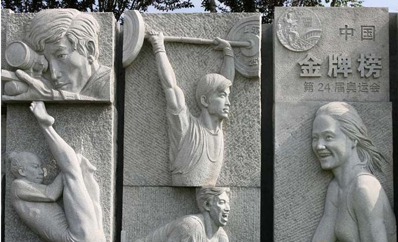 奧林匹克浮雕墻,全長312.61米,均高2.7米,采用珍珠黑花崗巖石材,共254塊(產地遼寧綏中福建),采取五種雕刻藝術手法,即圓雕、高浮雕、中浮雕、低浮雕及線雕。(設計雕刻單位為秦皇島航海者藝術有限公司,監制人為中央美院董祖怡教授)浮雕墻共分三大部分設計,即千年圣火、生命旋律、奧運中國。該墻以奧運歷史。無論展示、規模、形式以及內容為世界僅有,并申報吉尼斯紀錄。