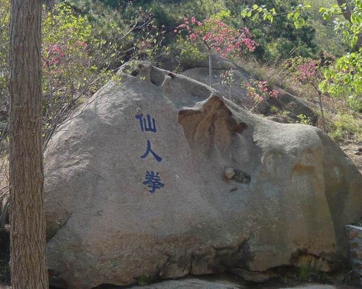 從石門澗逆溪水往山上走,過鰲魚石、剪子峰,來到麻衣山前,這里有麻衣庵的殘垣。據民國年間的《增修膠志》記載,晉代的陳仲舉、元代的張清源、明代的趙麻衣等名士曾在這里隱居過。庵后的峭壁上,有一懸空石室,室門鑿造得很精致,門高兩米,頂為孤形,有石門框和石雕門檻。在離石室前約3米處有刻有蓮花圖的蓮花石。《增修膠志》記載,在石室與蓮花石之間古有鐵板橋連接,人可攀蓮花石過鐵板橋進石室。石室東側的山壁上刻有“云逍庵”三字。石壁上還有李慶道等人署名的“玉泉觀旨緣”石刻,又有元代大德四年(1301年)孫榮題寫的“太清巖”刻字。庵東側有 “飛來石”,石前額刻“朝陽洞”三字。庵前有“說法石”,在說法石下,有一石碾底,透出過去這里的人間煙火氣息。庵西側的高處有一平臺,條石砌的建筑基礎很規整,站在這里可以東望靈山灣,西望龍灣,這是“望海樓”的故址。