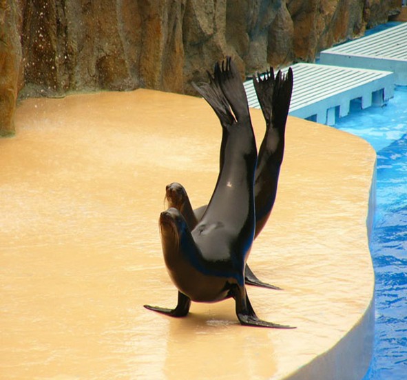 1997年5月從烏拉圭引進的4頭南美海獅(分別起名為“歡歡”、“樂樂”、“海海”、“琴琴”)更是非常聰明、可愛,是海獸表演家庭的幽默大師,別看它們其貌不揚,可在馴養師的嚴格訓練下,也能表演“握手”、親吻、問候、套圈、學人走路、鼓掌、再見、翻滾以及高難度的“頂球”、“單手倒立”、“一獅兩球”、《海獅學校》等近20余個精彩節目,其幽默滑稽的表演,令觀眾捧腹大笑。