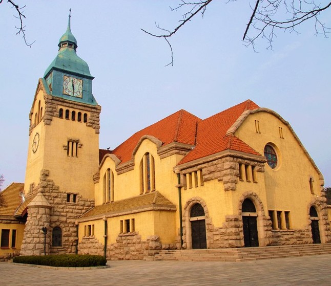青島基督教堂是青島一著名的宗教建筑,版權所有山東聊城聊之旅國際旅行社有限公司,轉載必究!山東省重點文物保護單位,位于青島市市南區江蘇路15號內小山丘上,東鄰美麗的信號山公園。教堂由德國膠澳總督府出資,于1908年4月19日奠基,1910年10月23日落成。當時作為在青的德國信徒禮拜的會堂,故又稱“德國禮拜堂”,又因教堂頂部有高39米的報時鐘樓,俗稱“鐘表樓”。它是一個典型的德國古堡式建筑,占地1000平方米,由鐘樓和禮堂兩部分組成。鐘樓高39.10米,登樓可觀賞島城的海天秀色。鐘樓上的巨型鐘表,給原本肅穆的教堂又增添了幾分神秘和莊重。禮堂寬敞明亮,可容千人之眾。18米高的大廳兩側分為樓上樓下兩層,裝飾十分精美典雅,置身其中給人以神圣之感,不愧是完美的基督教建筑藝術的佳作。在堂區院內建有二層樓房兩幢。一幢是該堂的附堂,一幢是傳教士的住宅。教堂前的廣場平坦寬闊,四周綠樹成蔭,周圍錯落有致地分布著各種西式建筑,更加襯托出教堂建筑的宏偉。每當晨曦漸擴,熹抹東天之時,遠山近樹、綠頂黃墻在曉霧中時隱時現,此情此景,不由令人疑為身處異域。沿著巖丘的窄階拾級而上,教堂堅固厚重的墻壁、半圓拱形花崗巖窗框、陡斜的紅色屋頂以及綠色尖頂的鐘樓便清晰地展現在眼前。用厚重的花崗巖壘砌的墻基凝重粗獷,使整個教堂的輪廓顯得清晰簡潔,給人一種宗教建筑特有的美感。 青島基督教堂1980年經整修后于同年11月2日恢復禮拜,成為“文化大革命”后青島市第一個正式開放的基督教禮拜堂。該堂亦是青島市基督教“三自”愛國運動委員會、青島市基督教協會的辦公地址。