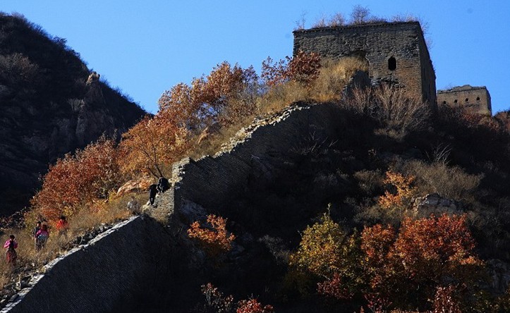 由關(guān)口順長城南上,沿途城墻至今保存完好,長城垛口隨山勢高低起伏,呈鋸齒狀,形勢別致而壯觀。沿線有兩座建筑獨特的敵樓,一是監(jiān)獄樓,此樓無門,只在正上方有一眼通氣孔,為古代戰(zhàn)時囚禁戰(zhàn)俘之用。通氣孔距地面1丈8尺,四壁光滑,難以攀附,戰(zhàn)時擒獲的敵人,由孔投入,絕難逃脫;二是七十二券樓,建筑造型在長城上獨一無二,此樓由大小七十二拱券結(jié)構(gòu)而成,造型美觀堅固,組合巧妙,實屬長城建筑的一大奇觀。