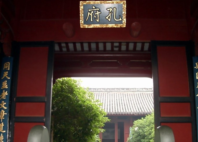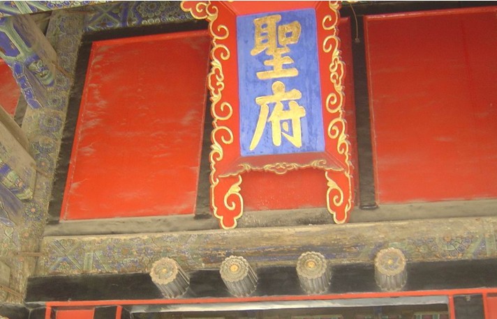 圣府大門就是曲阜孔府的大門,圣府為三間五檁懸山式建筑,匾書“圣府”二字,是明朝嚴嵩所書。門兩邊有對聯(lián)一幅“與國咸休安富尊榮公府第,同天井老文章道德圣人家”,其中“富”字少上面一點,寓“富貴無頭”,“章”字一豎通到上面立字,寓“文章通天”,此聯(lián)概括出千百年來“圣人家”。