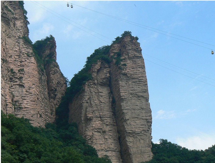 如果誰要是不知“層巒疊嶂”這個詞的確切含義,就到嶂石巖去讀吧。它的山巒成三疊,每一疊都如紅色屏 嶂石巖風,高一二百丈,廣數里,石壁光滑如磨,纖草不生,飛鳥難落,猿猴難攀。每兩疊間錯落成平臺,樹茂草豐,呈綠色環帶。