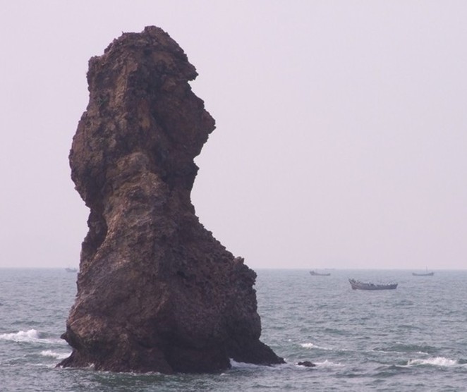 在午山腳下臨海斷崖南側,距岸百米處有一座17米高的石柱,形如老人坐在碧波之中