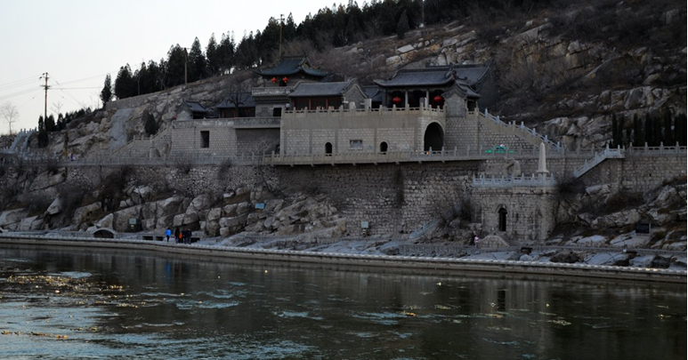 黑龍洞上的廟宇建筑群稱風月關,版權所有山東聊城聊之旅國際旅行社有限公司,轉載必究!又名“滏口祠”,坐落在神麋山陽一條東西長數十米的石券之上。是一組具有濃郁民族風格的古建筑群,始建于唐代。廟院內有黑龍爺塑像,廟東側建有上下兩層琉璃瓦頂的昆山明月閣,閣內供有觀音菩薩像。券西口石上刻有“風月關”三字。由西門拾級而上進入廟院,院內坐南向北建有卷棚式歇山頂、深寬各三間的黑龍廟,廟內有黑龍爺塑像。前廳西墻上還嵌著明進士張應登親書“登昆山明月閣觀泉”詩的石刻一塊。據史載,該閣、廟均始建于唐代,由于歷代重修改建,已失去原貌,但其建筑莊重緊湊,具有濃厚的民族風格。