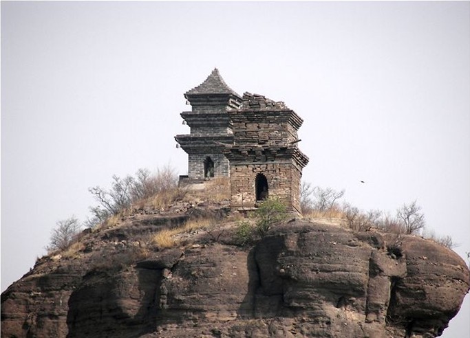 東、西、南三面墻是青磚壓縫,北墻齊縫直茬。1976年前北墻裂縫較大,寬處大約有20多公分,唐山大地震以后,磚塔不但沒倒,裂隙反而拼合。 峰頂各有磚塔一座,故名雙塔山。兩峰高低大體相同;北峰粗大,高40余米,周長74米。南峰上粗下細,周長34米。雙塔山陡直而立,高不可攀,近代無人上去過,峰頂磚塔何人、何時、何故所建,不得而知,一直是個謎;今人用望遠鏡觀測,北峰頂的磚塔高約2米,圓錐形,無門。南峰頂磚塔坐北朝南,高5米余,方形,邊長2米多,門高約1.5米,寬1.3米,四角置木據,有鐵棍挑出,上掛銅鈴。東、西、南三面墻是青磚壓縫,北墻齊縫直茬。1976年前北墻裂縫較大,寬處大約有20多公分,唐山大地震以后,磚塔不但沒倒,裂隙反而拼合。