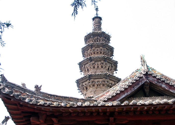 殿西矗立著北宋元祐二年(公元1087年)建造的大圣寶塔(俗稱青龍寶塔) 巍峨凌云。塔身八角七級,高17米,層層飛檐斗拱,節節精雕細刻,形狀各異。塔頂八角安裝8個鐵人,個個威風凜凜,閃閃發光。每個塔角各掛一個鐵鈴,風映鈴響,叮鈴不止。