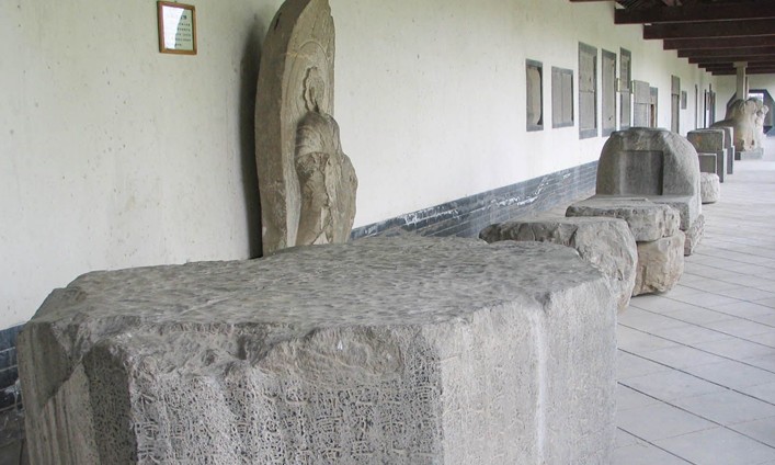 北魏阿彌陀佛說(shuō)法石造像,高5.85米,現(xiàn)藏青島市博物館,俗稱(chēng)丈八佛。庭院內(nèi)露天陳列許多珍貴文物,其中院東側(cè)護(hù)欄內(nèi),坐東面西、南北向并列4尊雕刻精美的北朝石刻造像和兩座石碑。中間兩尊石像高達(dá)一丈八尺,故稱(chēng)“丈八佛”。佛像身軀微傾,雙目細(xì)長(zhǎng),彎如新月,目光下視,面含微笑,兩腳跌立于刻有蓮花的石座上,顯示了距今1400多年前北朝時(shí)代宗教藝術(shù)的偉大成就。