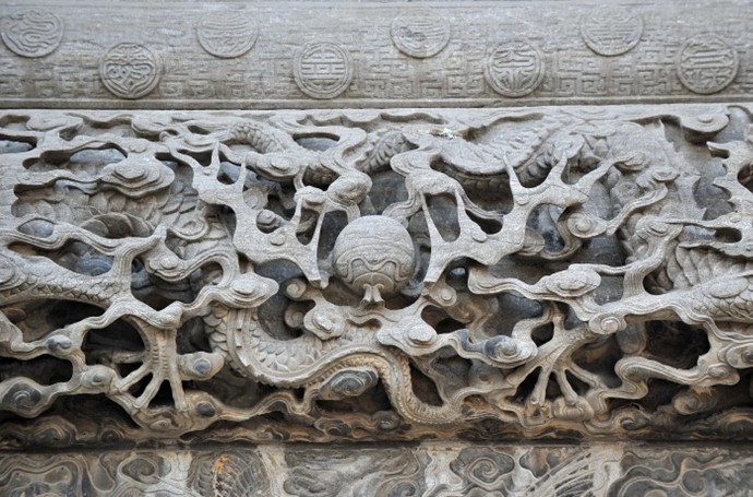 八根夾柱分八組雕刻百個石獅。大獅巨頭卷毛突目,隆鼻闊口利齒,巍然蹲踞,矯捷威猛。每個大獅身上攀伏著五個小獅,有的撓癢自娛,有的伏在大獅的腿上,舔咂撫鈴。獅座前左右三面浮雕圓形松獅圖,幼獅三三兩兩,蹦跳翻滾,爭戲繡球。每根立柱透雕四條蛟龍,在柔美飄逸的祥 云間卷舒出沒,盤旋回舞。正間上下額枋、次間額枋及正檐下“圣旨”匾四周鏤空透雕二龍戲珠,雕龍懸目奮爪,搖頭擺尾,如騰似飛。正間中額枋上分三層鏤空透雕串枝牡丹,給人以五彩繽紛、香沁肺腑之感。牡丹間以變形的“卍”字形云紋,寓意“富貴萬年”,樓檐下獸斗花拱,如意枋板承托。脊和檐角上雕配的吻獸、象尊、岔獸、魚、海馬、跑獸皆造型優(yōu)美,生動傳神。吻尾外卷張口吞脊,每個吻獸身上又浮雕兩條游龍,生動活潑,象馱寶瓶,憨態(tài)可掬。正脊中間雕塑二龍朝天,相托一珠瓶類飾物,像塔剎一樣高聳空中。其他部位也均浮雕、平雕有雙龍、牡丹、菊花、團(tuán)鶴、團(tuán)壽等吉祥圖,正間下枋板的孔鼻上還雕一懸掛石鳥籠,微風(fēng)吹來,石鳥翩翩展翅,呤叮作鳴。整座牌坊結(jié)構(gòu)精巧,宏偉壯觀,雕刻精細(xì),玲瓏剔透,繁而不亂,主次分明,是全國罕見的典型清代石雕建筑。