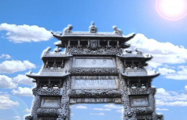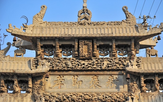 因雕有一百個不同書體的壽字而得名。坊以青色魚子狀石灰巖構成,通高l3米、寬8米,四柱三間三層樓閣式建筑。其獨特之處是:坊座雕有8頭矯健雄獅昂首遠望,8條出水蚊龍繞柱回舞,額枋上飾滿盛開牡丹,與正間上下額枋祥云間翩翩飛舞的5只透雕仙鶴、次間上額枋浮雕的相對翱翔之鸞鳳構成了具有無窮魅力之藝術佳作,寓意福壽萬年、富貴無媲或喜上眉梢。