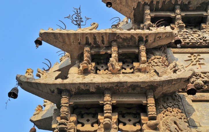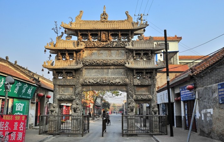 百壽坊俗稱朱家牌坊,位于單縣城內勝利北街,乃清乾隆三十年(1765年)為翰林院孔目贈儒林郎朱叔琪妻孔氏而建,因雕有一百個不同書體的壽字而得名。坊以青色魚子狀石灰巖構成,通高l3米、寬8米,四柱三間三層樓閣式建筑。其獨特之處是:坊座雕有8頭矯健雄獅昂首遠望,8條出水蚊龍繞柱回舞,額枋上飾滿盛開牡丹,與正間上下額枋祥云間翩翩飛舞的5只透雕仙鶴、次間上額枋浮雕的相對翱翔之鸞鳳構成了具有無窮魅力之藝術佳作,寓意福壽萬年、富貴無媲或喜上眉梢。