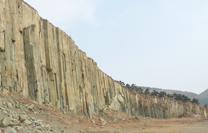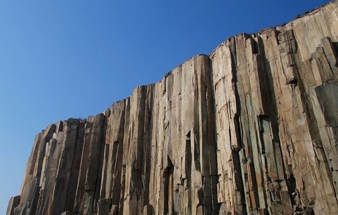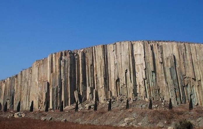 據(jù)考證,此山是1億多年前由火山巖漿冷凝而成,現(xiàn)裸露部分高達(dá)28米,厚約 30米,跨度達(dá) 150米。柱狀節(jié)理石柱群由無數(shù)根直徑一米左右、呈四棱、五棱或六棱柱狀的單個(gè)柱體緊密排列組成,氣勢(shì)雄偉,非常壯觀。柱體內(nèi)含有許多安山巖氣孔晶洞,洞內(nèi)有大量的方解石、冰洲石晶體,呈菊花瓣?duì)睿哂袠O高的經(jīng)濟(jì)價(jià)值、觀賞價(jià)值和科研價(jià)值。尤其在安山巖中,發(fā)現(xiàn)此柱狀節(jié)理在我國(guó)尚屬首列,是世界柱狀節(jié)理石柱三大奇觀之一,從規(guī)模和科研價(jià)值上,都可與世界聞名的英國(guó)玄武巖狀節(jié)理“巨人堤”和美國(guó)響巖體柱狀節(jié)理“魔鬼塔”相媲美。