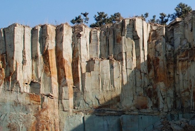 馬山石林位于山東省即墨市城西約7公里的馬山,山之西南部因巖漿冷凝,均勻收縮,形成四方柱狀節(jié)理,株體截面直徑約1米左右,高約30余米,筆直挺拔,排列緊密,恰似一片密林,蔚為壯觀,故名“馬山石林”。馬山位于青島市即墨城西約7公里,由4個(gè)相連的山包組成,形如馬鞍,故又稱“馬鞍山”,最高峰海拔211米。