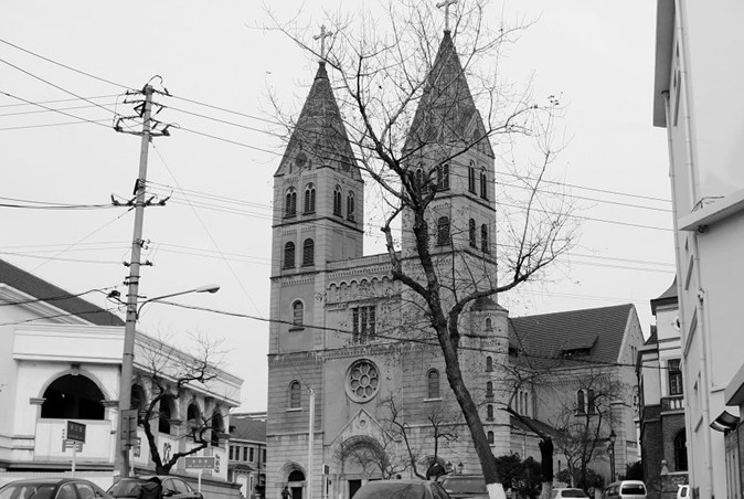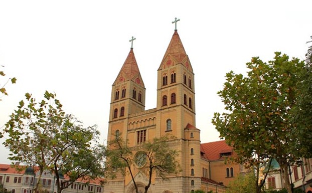 青島天主教堂本名圣彌厄爾教堂,由德國設(shè)計師畢婁哈依據(jù)哥德式和羅馬式建筑風(fēng)格而設(shè)計。擬建教堂應(yīng)高百米,適逢二戰(zhàn)爆發(fā),希特勒嚴(yán)禁德國本土資金外流,該教堂不得不修改圖紙,即建成現(xiàn)在規(guī)模。教堂始建于1932年,于1934年竣工。