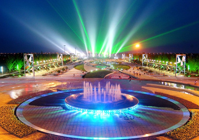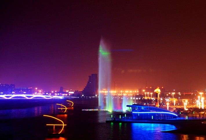 太陽廣場,占地9萬平米,最多可容納觀眾3萬人,中國水上運動會開幕式在這里舉行。廣場以“水”為創(chuàng)作元素,西部入口處是一個圓形噴泉;中間是一條蜿蜒曲折的溪流水景帶,溪流上建有幾座設計別致的小型景觀拱橋,溪流帶中間安放6組水上運動造型的鑄銅雕塑;廣場兩側各有兩組燈光廊架,白天是造型別致的雕塑,夜晚是絢麗多姿的燈光景觀。太陽廣場東側環(huán)抱水域中的是水中舞臺,有百米地下通道與舞臺水中地下室相通;舞臺東側是大型音樂噴泉,這是目前我省最大的音樂噴泉,也是國內為數(shù)不多的大型海水音樂噴泉之一,它有十多種水型變化,噴泉長112米,最大寬度為70米,主噴噴射高度達80米,是全國為數(shù)不多的海水噴泉之一。噴泉下面設有浮排和浮箱裝置,可以根據需要自由升降,配合燈光變幻,造型萬千,美不勝收。南端是一組彰顯海洋文化和水上運動特色的文化景墻,幾十座景觀照明燈在廣場中間赫然而立,盡顯雍容華貴。左側臨水處是幾組伸向瀉湖水中的瀕水大臺階,整齊流暢、恢宏大氣。