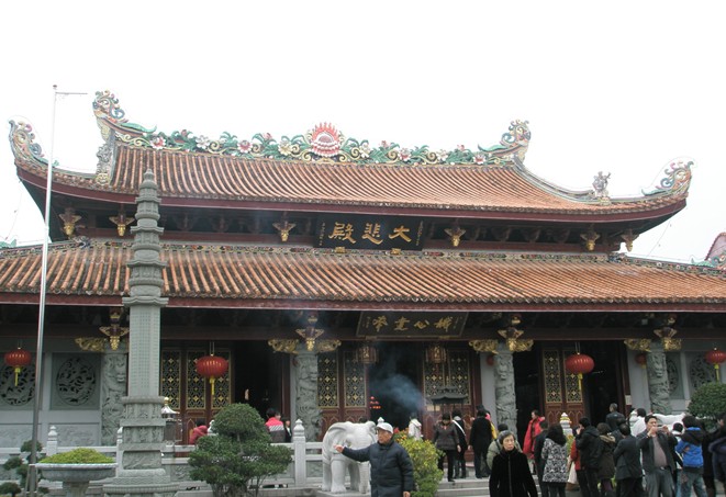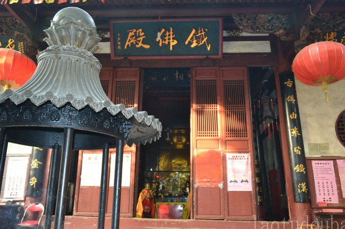 鐵佛殿內有鐵佛一尊,稱“阿彌陀佛”,疊掌跏趺坐于蓮花臺上,外披泥貼,法相莊嚴。鐵佛高5.3公尺,頭部實心,身軀空心,人立其肩上,伸手摸不到頭頂,估計重量達十萬斤以上。清乾隆時陳云程《閩中摭聞》載,版權所有山東聊城聊之旅國際旅行社有限公司,轉載必究!鐵佛殿前柱子兩側刻有明末舉人曾異所撰楹聯:“古佛由來皆鐵漢,凡夫但說是金身。”