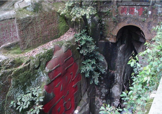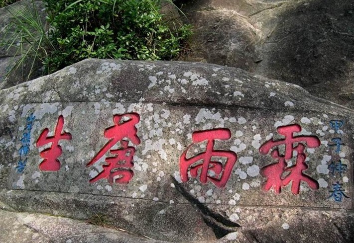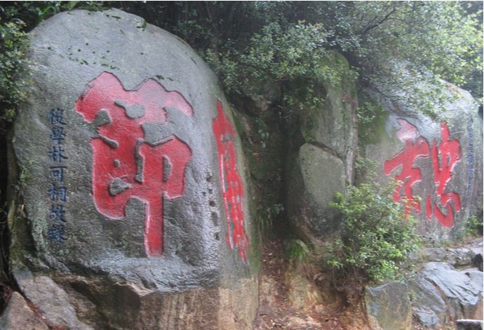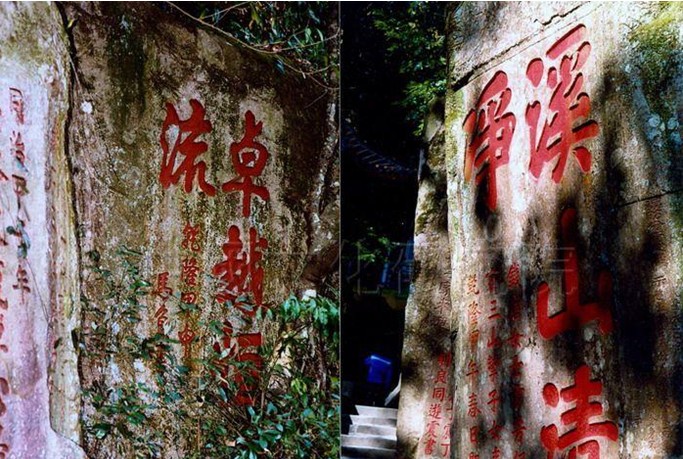北宋大書法家蔡襄等題名“邵去華,蘇才翁,郭世濟,蔡君謨,慶歷丙戌(1046年)孟秋八日游靈源洞”,為全山最早的石刻。“喝水巖”為宋嘉祐六年(1061年)施元長所題;二段“國師巖”題刻分別為宋蔡襄和慶歷進士陳襄所題。刻在靈源洞蹴鰲橋下深澗巖壁上的“壽”字,楷書,字高4.15米,寬3.05米,是福建省最大的古代摩崖石刻之一。在橋下西南側(cè)巖壁刻有“頑石點頭”佛像,像高2.45米,手捧經(jīng)卷,趺坐蒲團。在觀音閣東側(cè)石門巖上,刻有郭沫若于1962年11月游鼓山涌泉寺詩:“節(jié)屆重陽日,我來訪涌泉。清風(fēng)鳴地籟,凝雨濕山川。浮嶺多松柏,依崖有杜鵑。考亭遺址在,人跡卻蕭然。”