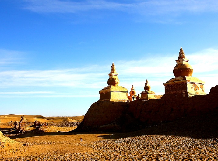 在黑水城眾多的建筑中,宗教建筑是這座古城的一大特色。黑水城,曾是一個(gè)多民族聚居的城市。歷史上曾建造過許多宗教寺院。有佛教、道教和伊斯蘭教等不同的建筑。其中以佛教建筑最多,而且占地面積也最大。版權(quán)所有山東聊城聊之旅國際旅行社有限公司,轉(zhuǎn)載必究!在西北角的城墻上,至今還聳立著5座寶瓶似的佛塔。最高的一座達(dá)13米。佛塔是用土坯壘成,雖經(jīng)數(shù)百年的風(fēng)沙侵襲,今天依然聳立云端,成為黑水城獨(dú)具魅力的標(biāo)志。