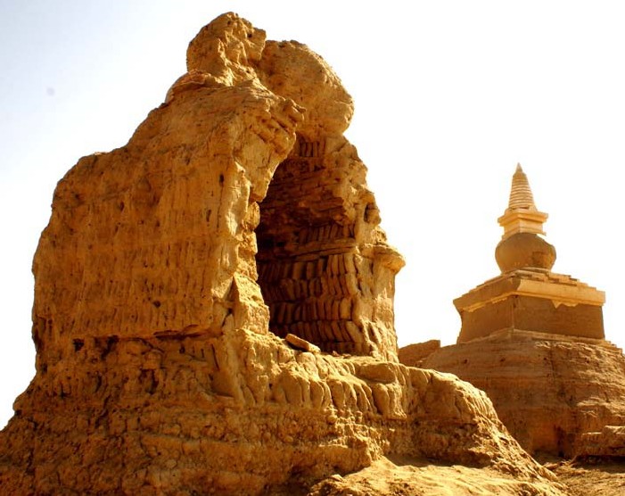 1350年前后,這里的情況發(fā)生了巨大的變化。昔日的綠洲,被沙漠吞噬,變成了一片荒漠。昔日繁華昌盛的黑水城也變成了一座廢城。現(xiàn)在它們的痕跡依稀可辨。磚石,瓦塊,陶瓷殘片,鐵器,雕刻,泥佛,風(fēng)化的白骨,破裂的石磨,塊壘等當(dāng)年的遺物。在古城遺址的西北角上,端坐著12米高的西藏覆缽式佛塔,古樸,圓融,安詳,是黑城的標(biāo)志性建筑。城內(nèi),荒涼滿目,流沙下遍布官邸、寺廟和民居的頹垣斷壁,到處都散落著各種瓷器和碎片。黑釉刻花、白釉褐彩,以及鈞瓷和南方的龍泉瓷等等。城外還有幾座殘缺不全的喇嘛塔,像是守城的衛(wèi)士肅然而立。