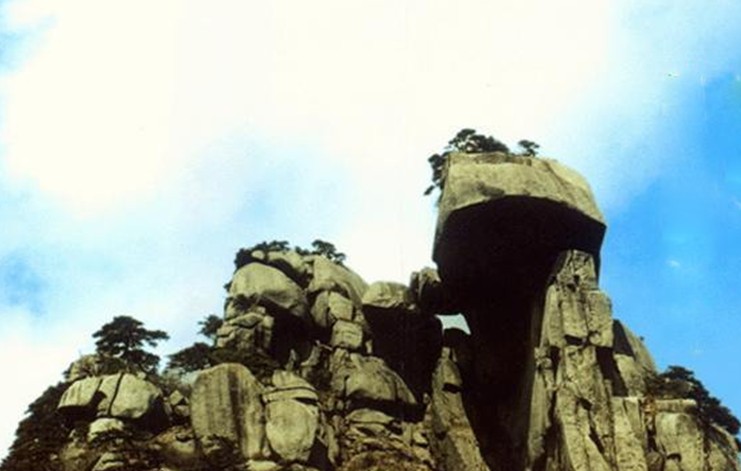 再往前走,有塊大石頭,叫“紗帽石”。長約10米,寬、高約8米,極像古裝戲中士大夫所戴的烏紗帽。相傳從明朝永樂年間開始,歷朝歷代,都有達官貴人騎著馬,坐著轎,專程前來焚香朝拜,以求加官晉爵,據說有求必應呢。從這順著臺階,可以到達天門臺,沿路步移景換,美不勝收。自天門臺、“結義松”上行50米,就到了拜佛臺,這是游人能夠登上的最高點,海拔1460米。站在這里,險峻的正頂已近在咫尺,仿佛舉手可及,卻又險不可攀,至今還無人登臨。向前看去,那就是“天生石佛”,你看他天庭飽滿,雙眼微合,鼻梁中挺,還有那豐盈的下巴和靈秀的頸項,一副慈眉善目的富態之相。當雨后初晴,偶爾會出現一道七彩虹,籠罩在大佛的頭頂上,那就是神奇的佛光,是石佛顯圣的吉祥征兆。過去,不論什么人,只要看到佛光,便要立刻下拜,因為看到它極不容易,所謂有緣者方可一見,“拜佛臺”亦由此而來。在拜佛臺上舉目四望,東南方的天柱山,西向的司空山,北面的明堂山,還有大大小小的峰巒丘壑,都盡收眼底,豪邁之情油然而生。