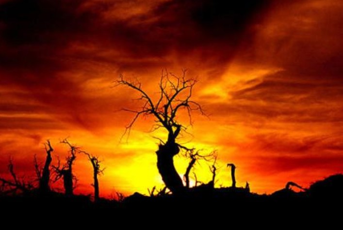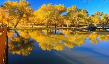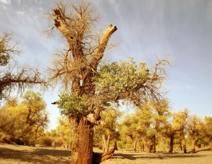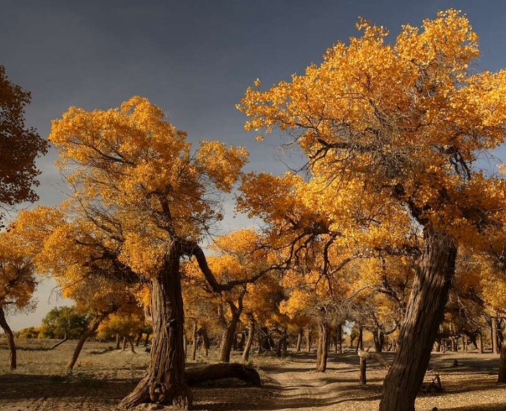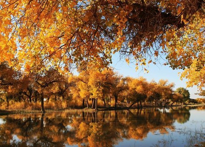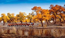 內蒙古阿拉善盟的額濟納旗,現有天然胡楊林45萬畝,是世界僅存的三大胡楊林之一,是國家自然保護區和國家森林公園。胡楊林是一個古老的樹種,被譽為“植物活化石”,有“生一千年不死,死一千年不倒,倒一千年不朽”的美譽。胡楊,又名“梧桐”,為古地中海殘遺物種,屬落葉喬木,蒙古語稱為“陶來”。胡楊木質纖細柔軟,樹葉闊大清香,耐旱,生命力頑強,是自然界稀有的樹種之一。金秋十月,額濟納是一個童話般的世界。胡楊金葉掛滿枝頭,細細看來,在樹枝間竟尋不到一片異色葉子,密密匝匝,金光燦爛,至純至美;遠遠望去,一片片金色的胡楊把大漠裝點得如詩如畫,匯集成金色的海洋,吸引著大批國內外賓客到此旅游、采風、攝影。
