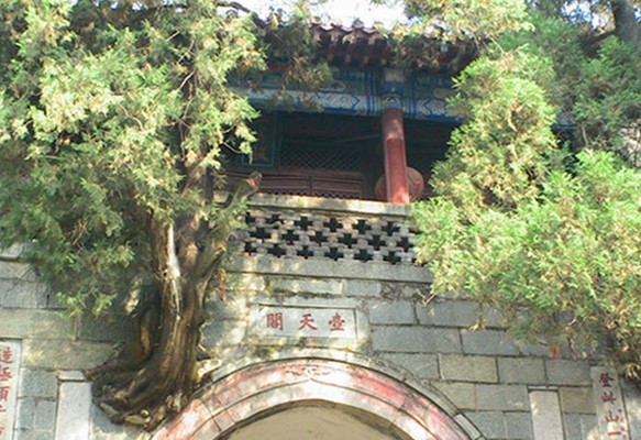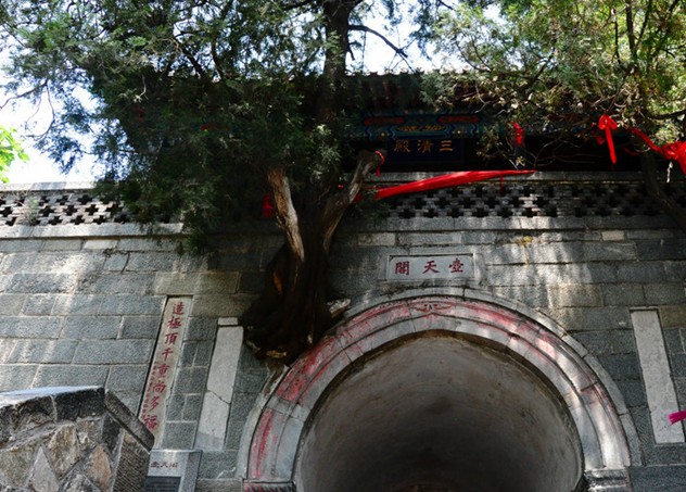 清嘉慶六年即公元1801年泰安太守崔映辰題聯:“壺天日月開靈境,盤路風云入翠微。”嘉慶二十一年即公元1816年泰安府事廷璐又聯:“登此山一半已是壺天,造極頂千重尚多福地。”這里海拔為800米,大致是泰山高度的一半,門洞有雙柏自墻中橫生,東西對峙,盤旋而上,宛如守護山門的雷祖、真武二將軍,堪稱奇景。