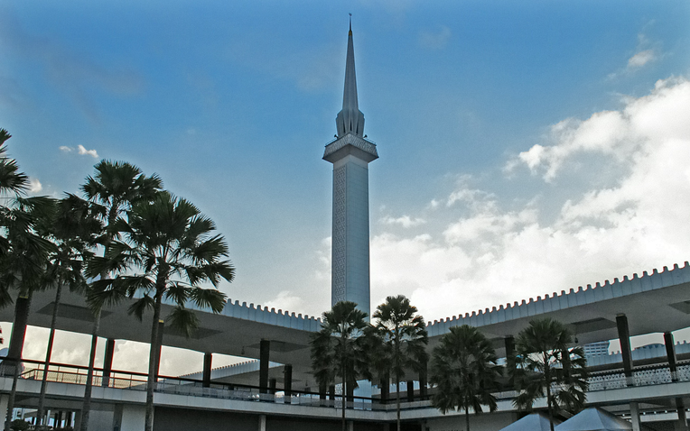 伊斯蘭教是馬來西亞的國教,清真寺遍布全國,吉隆坡市中心的國家清真寺,占地5.5公頃,于1965年建成,這是一組包括祈禱大廳、大尖塔、陵墓和辦公大樓的建筑群,其造型和裝飾與麥加的三大清真寺相仿,氣勢恢弘,是伊斯蘭建筑藝術(shù)的杰出代表