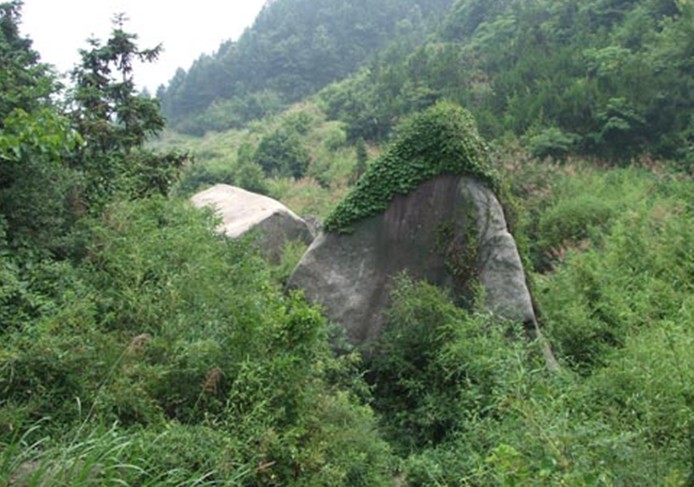 石船或曰船石,在白云崖下澗溝中,石長20余米左右,寬、高均在10米左右,船首、船身、船尾、船倉,輪廓畢具,線條分明;似經起重機吊起,有意墊放幾塊小石于其下,淙淙泉水自船底流過,欲濕不濕;船頭高翹,氣宇軒昂;船前溝壑陡落千丈,大有潮生即發,直瀉江河之勢。