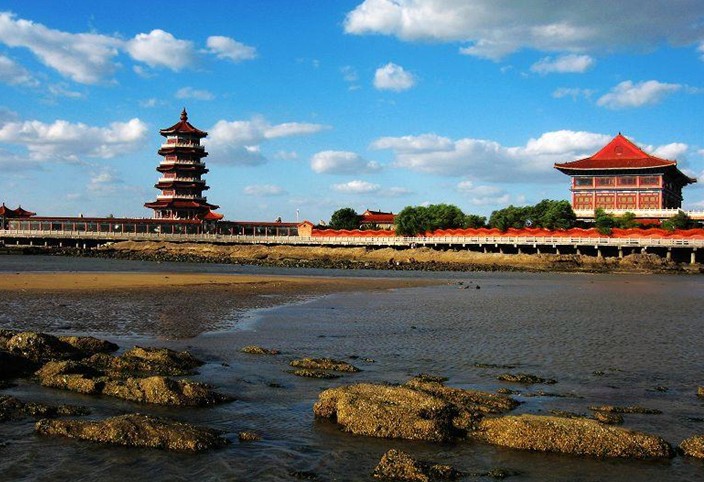 位于海水浴場(chǎng)東側(cè)海中,西與蓬萊遙遙相望的八仙渡海口,是根據(jù)八仙過海神話傳說填海新建的景區(qū),填海面積3.3萬平方米,如果從空中俯視恰似丫腰葫蘆一般。游龍起伏脊的南部外墻,龍首位于正門兩側(cè),墻體內(nèi)側(cè)嵌有諸神如甲子神、日游神、夜游神及生肖圖案等漢白玉浮雕70余方。景區(qū)內(nèi)建有民族風(fēng)格古典式建筑的大型八仙過海漢白玉照壁、流軒、挹清軒、八仙祠、三星殿、財(cái)神殿、放鶴亭、環(huán)形步廊等。