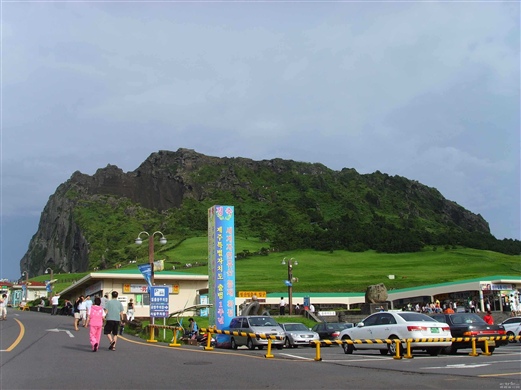 城山日出峰海拔182米,系10萬(wàn)年前海底火山爆發(fā)而形成,位于濟(jì)州島東端(33°27′北,126°56′東),是一塊高聳的巨巖,其頂部有巨大的火山口。