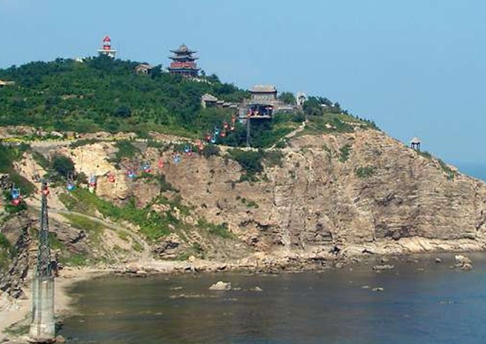 田橫山俗稱老北山,地處蓬萊陸地最北端,也是膠東半島最北端,這塊突入海中的陸地岬角稱為登州岬或蓬萊岬,是渤黃二海的分界處,具有“一山分二海”的獨特地理位置。東與丹崖山隔一小海灣相接,石壁高峻;西、北兩面半浸海中,形勢險要。漢時韓信破齊,齊王田橫率其徒五百人東走,曾筑寨于此,因此得名。明萬歷二十一年(1594年),為鞏固海防,明廷調浙江兵卒于此戍守,在山上筑起城垣和署衙廨宇。清光緒二十年(1895年),中日甲午戰起,登州統領夏辛酉在山上筑起炮臺,架起愛母斯郎炮數門,守護???,兼為旅順之聲援。這里既有山海勝境,又有歷史遺跡,隨著旅游事業的發展,到這里探古覽勝的游人不斷增加。 1993年,田橫山與丹崖山之間架起了一條跨海索道,這里成為蓬萊閣旅游區的一個組成部分。在跨海索道上乘坐纜車,仰望前后兩側的仙山瓊閣,俯瞰大海的萬里澄波,聯想三神山的迷人神話,會不由自主地產生一種飄飄欲仙的感覺。(跨海索道全長481米,高點海拔50.7米,相對落差26.3米,采用單循環半包吊椅式結構,共設纜座54個,日可載客5340人次,是山東省第一條海上索道。它區別于其它索道的地方就是可以搭乘纜車領略海上風光,在感受上是別有情趣的。