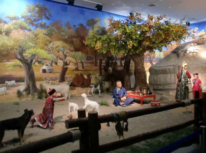 博物館阿拉善民族民俗展廳,建筑面積1300平米,展有款式多樣的阿拉善蒙古族服飾、代表禮儀至尊的阿拉善烤全羊、聞名遐邇的阿拉善蒙古族養駝馴駝技藝、工藝精湛的阿拉善仿古地毯、悠揚綿長的長調民歌、英武雄健的沙力搏爾式摔跤和神奇精湛的阿拉善蒙醫蒙藥等139件裝飾實物和民間藝術品。