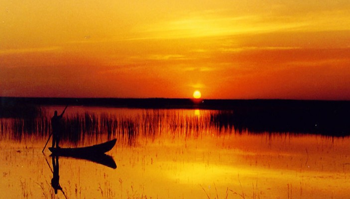 遠(yuǎn)看湖面,黑壓壓的一片,像是塘上殘留的荷蒂。走近了才看清,原來(lái)都是鳥(niǎo)兒。黑色的是野鴨,白色的是白鶴,雜色的竟是鴛鴦。其實(shí)種類(lèi)還多著呢,連當(dāng)?shù)厝艘舱f(shuō)多得叫不出名字來(lái)。鳥(niǎo)兒看見(jiàn)人走近了,前面的就往后邊飛去,如是一撥又一撥地飛飛停停,像跟你開(kāi)著一個(gè)永遠(yuǎn)的玩笑,也跟你保持著一定的距離,這時(shí)你會(huì)認(rèn)同書(shū)上所說(shuō)的:這是在全球荒漠和半荒漠地區(qū)中,為數(shù)不多的鳥(niǎo)類(lèi)遷徙地和繁殖地。最難忘的還是烏梁素海的日落。只見(jiàn)夕陽(yáng)映在湖面上,變成一條金色的柱子,從遠(yuǎn)方地平線(xiàn)的湖面上延伸而來(lái),九十度筆直地豎在你的跟前。只有偶爾飛起的野鴨或鳥(niǎo)兒掠過(guò)金柱,生就帶出一筆畫(huà)意。當(dāng)夕陽(yáng)完全西沉了,這時(shí)飛鳥(niǎo)的啁啁聒噪聲,像是在惜別黃昏,再見(jiàn)夕陽(yáng)。