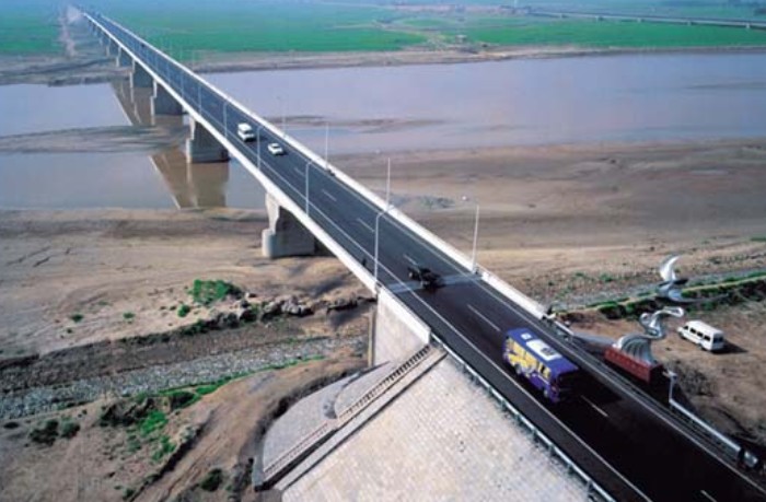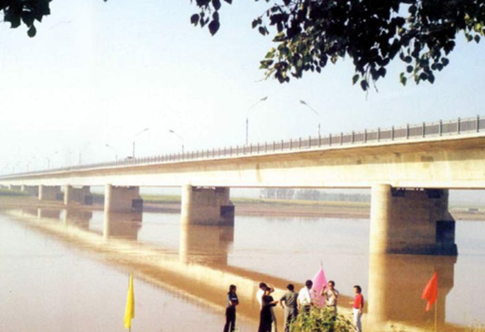 位于市南郊,它是從包頭市白云鄂博到陜西等省通衢的重要組成部分。大橋全長810米,主孔12孔,每孔跨徑為65米,橋面寬12米,下部由14墩臺組成,上部構造為預應力鋼筋混凝土箱式連續梁,采用最新工藝多點頂推法施工。上部結構為3聯4孔65米預應力鋼筋混凝土連續箱梁,跨徑組合為3*(4*65)+20米,1983年建成通車,是黃河中上游最大的橋梁之一。設計荷載汽車—20級;拖車—100級。