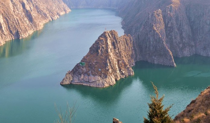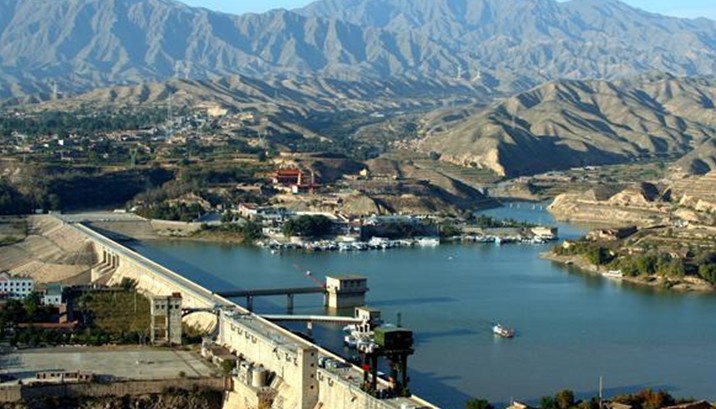 在甘肅永靖縣境內。黃河兩岸崇山峻嶺, 形成峽谷。1974年建成具有發電、防洪、灌溉、養殖、航運等功能的綜合性水利樞紐工程。一條長840米、高147米的巨大攔河壩把黃河攔腰斬斷, 形成了劉家峽水庫(庫容57億立方米,水域面積130平方公里),大壩下安裝了五臺國產大型水輪發電機組,成了總裝機容量122.5萬千瓦年發電量57億度的黃河上游第一座水力發電站。