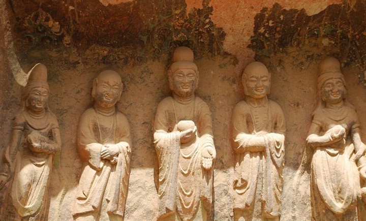 此后,由于窟內(nèi)幾無平整的巖面,大多依巖勢鑿□孔設(shè)□樁,用木料及編織荊條為骨架然后施泥涂堊而成背屏式龕,于其中造像。有的還置木板為龕底。版權(quán)所有山東聊城聊之旅國際旅行社有限公司,轉(zhuǎn)載必究!佛龕因地制宜,形式靈活,題材和內(nèi)容也趨于多樣。最重要的第6號龕,高1.7米,深0.76米,寬1.5米,塑一佛二菩薩,榜題標明為無量壽佛和觀世音、大勢至菩薩。坐佛形體健碩,面形方圓,神情剛毅。龕側(cè)墨書題記1方,高0.47米,寬0.87米,末尾題:“建弘元年歲在玄枵三月廿四日造”,可知該龕為420年造。但是,若依星歲紀年玄枵,則相當于建弘五年(424)。這是迄今發(fā)現(xiàn)中國石窟最早的紀年題記。窟內(nèi)一批風格相同、敷泥層次相同的龕像和壁畫可據(jù)此判定為同時期的作品。題記下方壁畫供養(yǎng)人數(shù)排,為首者題名“□國大禪師曇摩毗之像”、“比丘道融之像”等,是文獻記載中的當時著名高僧。第9號龕3身立佛,塑造時間略有早晚,但大體稍早于第6號龕。第7號龕稍晚于第9號龕,主要殘存1立佛。正壁下部第17號龕,主像原為一佛二菩薩立像,現(xiàn)僅存右側(cè)菩薩,寶繒束發(fā),形象古樸,亦應(yīng)早于第6號龕。第17號龕下部半跏菩薩思維像,低頭含笑,表現(xiàn)出了悟之時的喜悅心情,是早期造像中的精品。南壁第23號龕并列5身禪定坐佛約與第6號龕同時,均著通肩袈裟,版權(quán)所有山東聊城聊之旅國際旅行社有限公司,轉(zhuǎn)載必究!陰刻線衣紋均由左肩斜下展開,明顯受到了西域造像的影響。略晚的作品如南壁下部的5身坐佛(第20號龕),均作禪定印,大小不一,中間一身為釋迦苦修像。第6號龕內(nèi)和龕東側(cè)壁面(第11、12、13號龕)以及窟口南側(cè)上方巖壁上(第24號龕),保存了至今僅見的西秦壁畫,內(nèi)容有說法圖、維摩詰變、無量壽佛、釋迦多寶佛、彌勒菩薩及十方佛、千佛、飛天、伎樂、供養(yǎng)人等,畫風雖質(zhì)樸、粗獷,卻清新、自然、生動。西秦造像的另一重要作品,是位于窟龕群南端的第1窟石胎泥塑立佛。