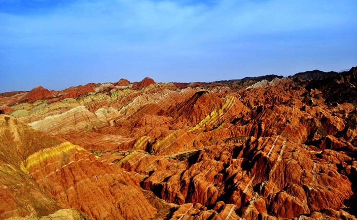 張掖丹霞地貌分布廣闊,場面壯觀,造型奇特,色彩艷麗,是我國干旱地區最典型和面積最大的丹霞地貌景觀,具有很高的科考價值和旅游觀賞價值。張掖的丹霞地貌集中分布在臨澤、肅南兩縣境內,面積達300多平方公里以上,是中國丹霞地貌發育最大最好、地貌造型最豐富的地區之一。層級錯落交替、巖壁陡峭、氣勢磅礴、形態豐富、色彩班斕而稱奇,有七彩峽、七彩塔、七彩屏、七彩練、七彩湖、七彩大扇貝、火海、刀山等奇妙景觀令人不得不贊嘆大自然的鬼斧神工。