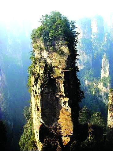 南天一柱位于張家界國家森林公園內,黃獅寨游覽線一帶。穿過南天門,一石峰從深不可測的溝谷中沖天而立,上下一般粗細,有如鎮山之衛士。精悍瀟灑,超凡脫俗。武陵源怪石繁多,此為一典型代表,當風化作用使巖石化解、碎裂,以及水蝕作用使其沿裂面附和崩塌,故而形成拔地而起的孤立石柱。