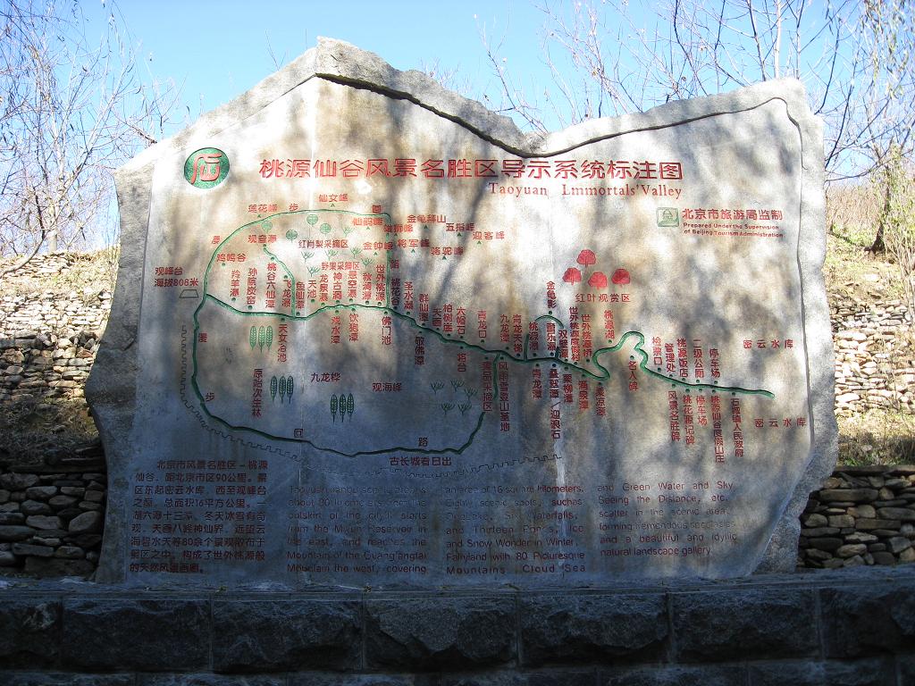 桃源仙谷風景名勝區,距北京90公里,東起密云水庫西岸,西至觀峰臺頂巔,全長8公里,總面積16平方公里,景區峽谷森林茂密,潭瀑眾多,山峰雄偉,環境潔美,特別是“一湖六瀑十三潭,冬天冰雪有奇觀,天畫八峰神仙界,遠望云海碧水天”等80余景觀鑲嵌其中,構成了世外桃源的一幅天然風景畫廊。