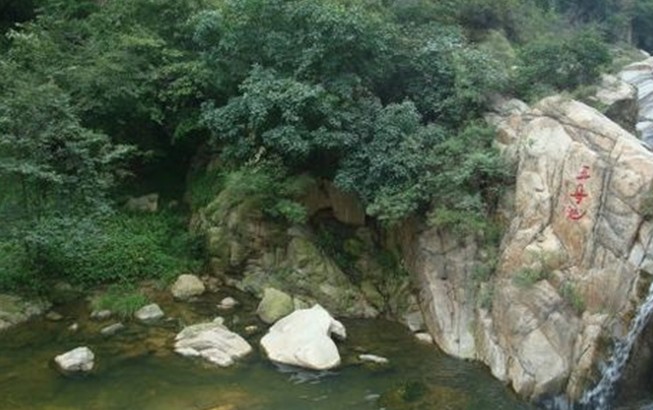 谷中怪石林立,一條小溪自谷中流過。在溪谷下游有三級斷崖,形成三級瀑布,水流直下,濺起萬朵銀花。在瀑布左上方,有一塊巨石疊立,高達10余米,遠望之,恰似一嫻淑的仙女在俯首凝思,人稱王母石。 相傳古時瑤池王母東巡泰山途經此地,見此處幽靜,便飄然臨下,于池中沐浴,流連忘返,化而為石,常駐池邊。后人便將王母沐浴處稱為“王母池”,并在池旁半山腰建起王母廟。廟對面有一棵重約10噸的碩大石桃,上刻桃一熟,歲九千。