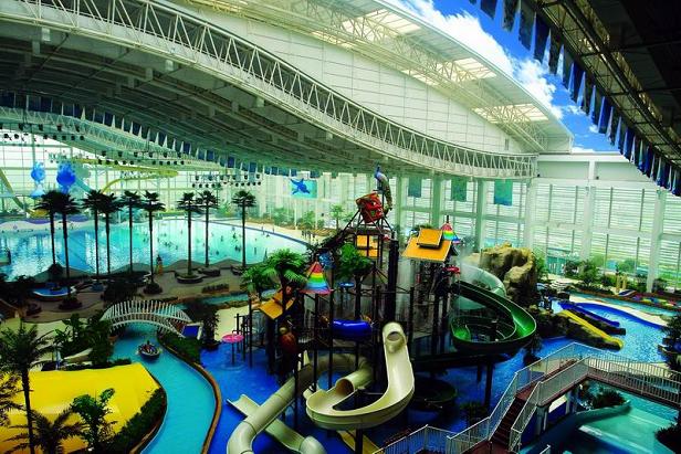 建筑面積約20000㎡,點式玻璃幕墻裝飾外墻,南向遮陽百頁可調(diào)角度,以控制陽光的射入量;跨度達70M的可開啟屋頂別具一格。"水空間"項目在亞洲目前是比較先進的以水為主題的水上娛樂場館,它可以同時容納5000人在館內(nèi)進行娛樂消費。場內(nèi)設(shè)有標準國際比賽游泳池、人工造浪達216種、滑板沖浪、室內(nèi)太空盆、競技速滑、漂流河道、生態(tài)沙灘、兒童戲水池、家庭互動區(qū)及餐飲區(qū)、半地下水景,咖啡屋,商品部、休閑區(qū)、貴賓間、仿生綠植等。更值得一提的是漂流河有室內(nèi)和室外部分,夏季互相連通,加上室外泳池和12個溫泉泡池,室內(nèi)外相互交融自然和諧。另外,構(gòu)思新穎的水中升降舞臺還可舉辦富有民族特色的歌舞晚會、水上婚禮、服裝展示等大型活動。