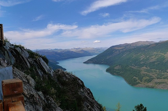 觀魚亭建于海拔2030米的哈拉開特(蒙古語意為駱駝峰)山頂上,與湖面的垂直落差達600多米,因處于觀察“湖怪”的最佳位置,故得名觀魚亭。去觀魚亭有兩條路可供選擇:一條是乘汽車從山后繞行到山腰;另一條是從湖出水口山前專為爬山者鋪設的石階盤旋步行而上。登上湖西邊山頂的“觀魚亭”,可觀看喀納斯湖的整體美景。其一可鳥瞰喀納斯湖,四分之三的湖面盡收眼底。湖面呈綢緞般光滑平靜,宛如一塊色彩斑駁的翡翠鑲嵌在山谷之間,并向下游河谷蜿蜒流淌,波光閃耀,飄散著童話般的色彩。順河水之勢望去依稀可見神仙灣、臥龍灣等河曲,草色木色水色在逆光下不斷變幻,充滿了鮮活的靈性,體現出細膩、幽雅的南國秀色般的美麗;其二可觀覽湖周層巒疊嶂、翠峰倒影、云起波濤的秀麗山色;其三舉目北望,從南向北蜿蜒而上的喀納斯湖水被群山阻擋,山巒之中可清楚地看到阿爾泰山的最高峰——友誼峰(4374米),山頂雄偉壯麗的冰雪世界,猶如一塊光潔晶瑩的白玉,聳立于群峰之巔。而 “U” 谷、古冰斗、冰磧壟等古冰川地貌遺跡,分布在喀納斯湖兩側的高山和河谷內,證明湖區曾有過多期冰川活動。