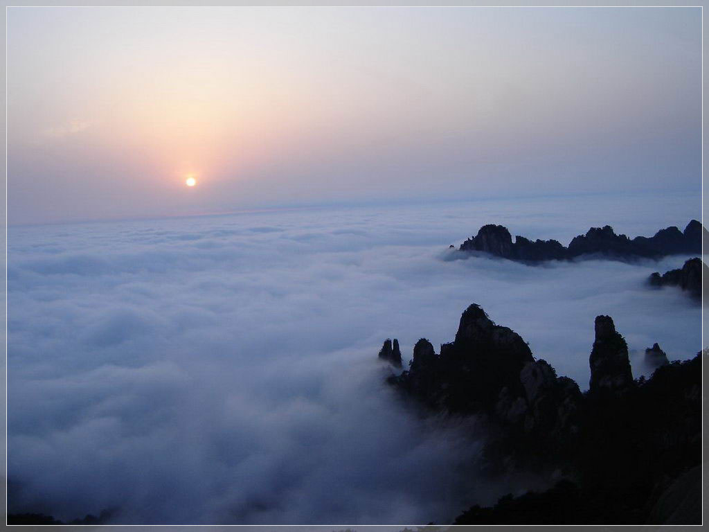 大凡高山,可以見到云海,但是黃山的云海更有其特色,奇峰怪石和古松隱現云海之中,就更增加了美感。黃山一年之中有云霧的天氣達200多天,水氣升騰或雨后霧氣未消,就會形成云海,波瀾壯闊,一望無邊,黃山大小山峰、千溝萬壑都淹沒在云濤雪浪里,天都峰、光明頂也就成了浩瀚云海中的孤島。陽光照耀,云更白,松更翠,石更奇。流云散落在諸峰之間,云來霧去,變化莫測。風平浪靜時,云海一鋪萬頃,波平如鏡,映出山影如畫,遠處天高海闊,峰頭似扁舟輕搖,近處仿佛觸手可及,不禁想掬起一捧云來感受它的溫柔質感。忽而,風起云涌,波濤滾滾,奔涌如潮,浩浩蕩蕩,更有飛流直瀉,白浪排空,驚濤拍岸,似千軍萬馬席卷群峰。待到微風輕拂,四方云慢,涓涓細流,從群峰之間穿隙而過;云海漸散,清淡處,一線陽光灑金繪彩,濃重處,升騰跌宕稍縱即逝。云海日出,日落云海,萬道霞光,絢麗繽紛。