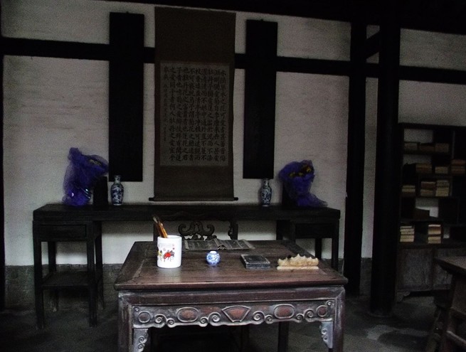 進入大門,首先映入眼簾的是前中共中央總書記胡耀邦瞻仰周恩來故居時親筆題寫的四個大字:“全黨楷模”。向北不幾步就是周恩來小時候讀書處——家塾館。里面有周恩來當年用過的單人學桌。在這張學桌上,他以不同尋常的聰穎和智慧,經常和同窗共讀的同輩兄弟用方塊字做聯句、拼詩的“益智游戲”。