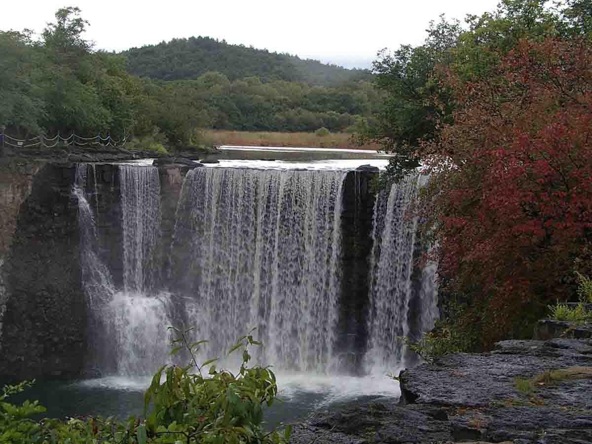 吊水樓瀑布,古時土著人名曰"發庫",位于湖之北端,距"鏡泊山莊"僅三公里。從"鏡泊山莊"乘車,沿著一條山路,便可抵達龍泉山腳下的冷食店"湖光閣"。由"湖光閣"向左轉,駛進盤山曲徑,通過急流上懸架的"飛虹橋",再穿越一段枝葉交錯的綠色長廊,一座古樸雅致的六角亭臺便出現在眼前。此時,瀑布瀉落的轟鳴之聲不絕于耳,撲面的微風夾雜著一股股沁人的清新與甘甜。游人至此多于亭中小憩,然后步行穿過一片闊葉林,呼嘯奔騰、氣勢磅礴的"吊水樓瀑布"便映入眼簾。版權所有聊城聊之旅旅行社有限公司,轉載必究!吊水樓瀑布酷似聞名世界的"尼亞加拉大瀑布"。湖水在熔巖床面翻滾、泡哮,如千軍萬馬之勢向深潭沖來,然后從斷巖峭壁之上飛瀉直下,撲進圓型甌穴之中。潭水浪花四濺,如浮云堆雪,白霧彌漫;又似銀河倒瀉,白練懸空。水聲震耳如有雷鳴。瀑布一般幅寬四十余米落差為十二米。雨季或汛期,瀑布呈現兩股或數股迭落,總幅寬達二百余米。