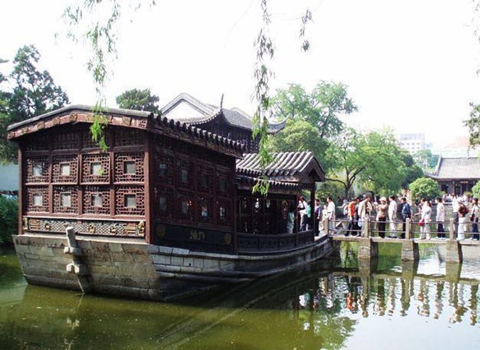 瓶形的水池是人工開鑿的,整個水池周長約1866米,面積約占全園面積的一半多。池水清澈,水池四周全部用明代城磚駁岸,顯得非常古雅。水池的南端,有一座長14.5米的仿木船式石肪。據說這座石舫是兩江總督尹繼善為了自己享樂,在清代乾隆十一年建造的。石舫上的“不系舟”匾額是當年乾隆皇帝南巡時所題。中國有句古語: