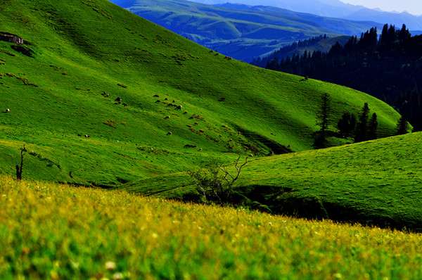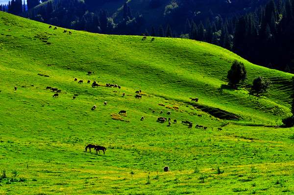 那拉提草原是發育在第3紀古洪積層上的中山地草場,東南接那拉提高嶺,勢如屏障,西北沿鞏乃斯河上游谷地斷落,地勢大面積傾斜,山泉密布,溪流縱橫。版權所有山東聊城聊之旅國際旅行社有限公司,轉載必究!緣山腳沖溝深切,河道交錯,森林茂密,莽原展緩起伏,松塔沿溝擎柱,還有氈房點點,畜群云移,是鞏乃斯草原的重要夏牧場。