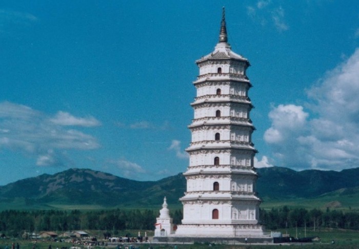 遼釋迦佛舍利塔,俗稱遼慶州白塔,當(dāng)?shù)孛晒抛迥撩駛兎Q“金金察罕索布爾嘎”,位于內(nèi)蒙古自治區(qū)巴林右旗索博日嘎蘇木駐地東北查干沐淪河的沖積平原上,是遼代鼎盛時(shí)期的重要州城———慶州城西北部,為第三批國家重點(diǎn)文物保護(hù)單位。