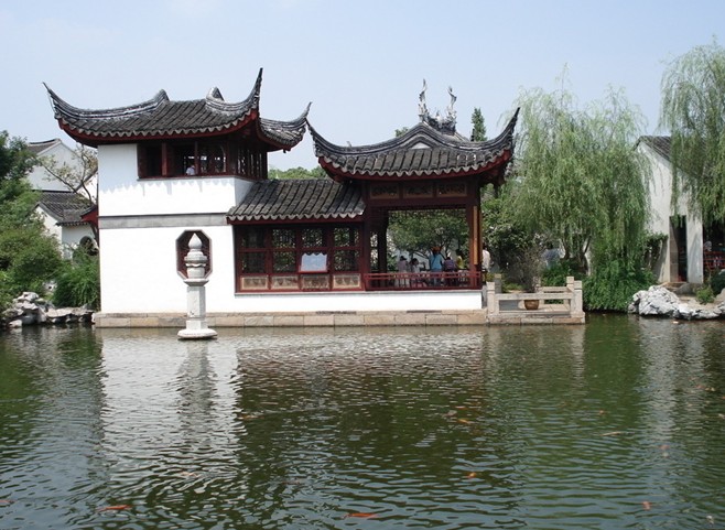 與玲瓏花界隔湖相對的建筑是望春樓和小李將軍畫本。他們完全是江南園林的風格,建筑規模從屬于熙春臺,色調顯得清心淡雅,體現了南方之秀。望春樓下層南北兩間分別為水院、山庭,將山水景色引入室內。卸去樓上的門窗就變成了露臺,是中秋賞月的好地方。